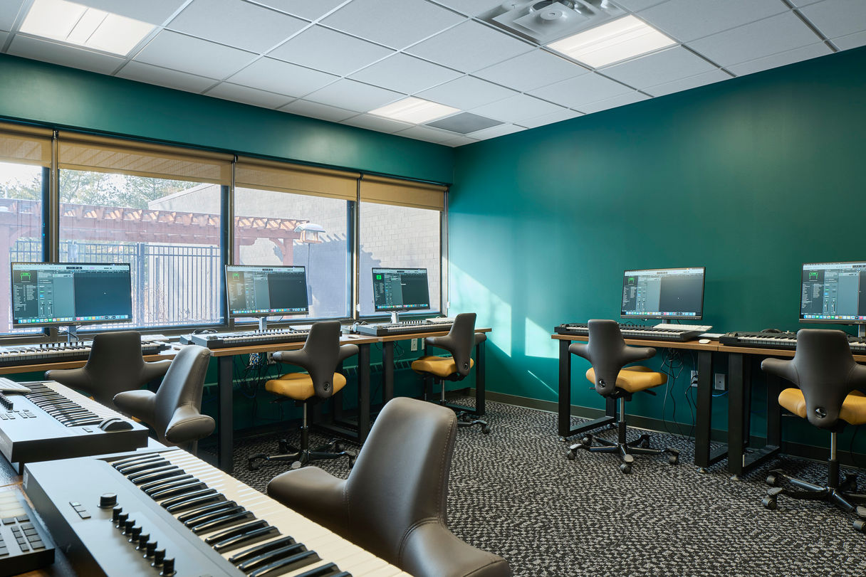 Strategic renovation and systems coordination transformed the building into a high performance educational environment. Teaching studios, classrooms, and offices were carefully designed with enhanced acoustic separation, supported by a “push and pull” acoustics mitigation strategy along corridors. HVAC, lighting, and advanced A/V systems were integrated to serve instructional, administrative, and performance needs. A creative resource management approach increased the volume of the performance hall by excavating downward rather than adding height, yielding significant cost savings.