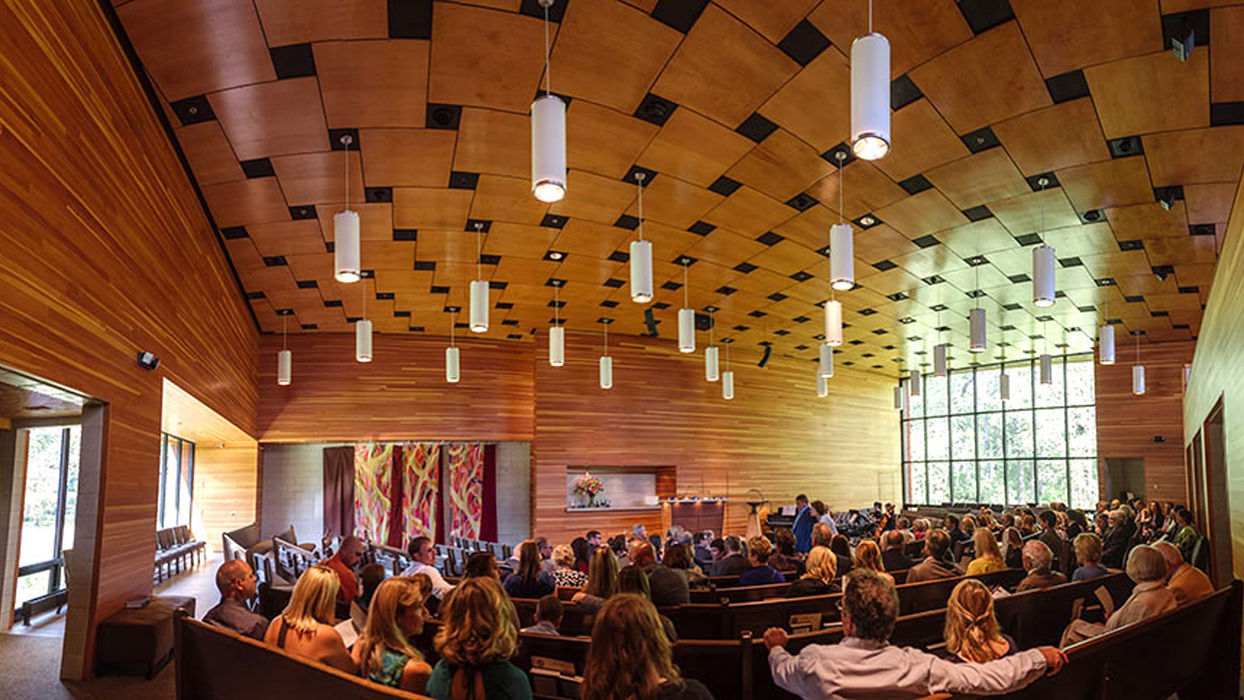 The project replaces a traditional sanctuary model with a flexible Meeting Hall while carefully integrating a modern addition with the existing Methodist-era structure. The architecture emphasizes openness, inclusion, and connection, reflecting Unitarian Universalist values. Corridors and gathering spaces are aligned to frame views of the surrounding woods and wetlands, extending the experience of sacred space beyond the building’s walls. Inside, warm Douglas fir paneling and an adjacent gallery celebrate craftsmanship, nature, and the artistic contributions of congregation members.
